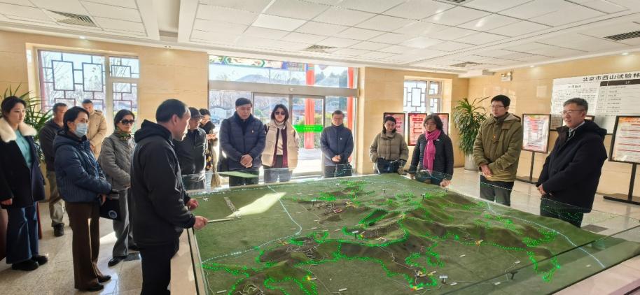 全体人员从红色地标步入绿色画卷,实地考察西山试验林场生态建设成效。在林间步道,大家切身感受西山由“荒山秃岭”到森林覆盖率超95%“首都绿肺”的巨大蜕变,并听取林场管理处副主任王平玺对“场园一体”发展战略的介绍。参观中,大家结合专业所长,就国有林地多功能利用、生物多样性保护等议题与林场工作人员深入交流,在沉浸式研学中领悟生态文明建设的实践伟力。