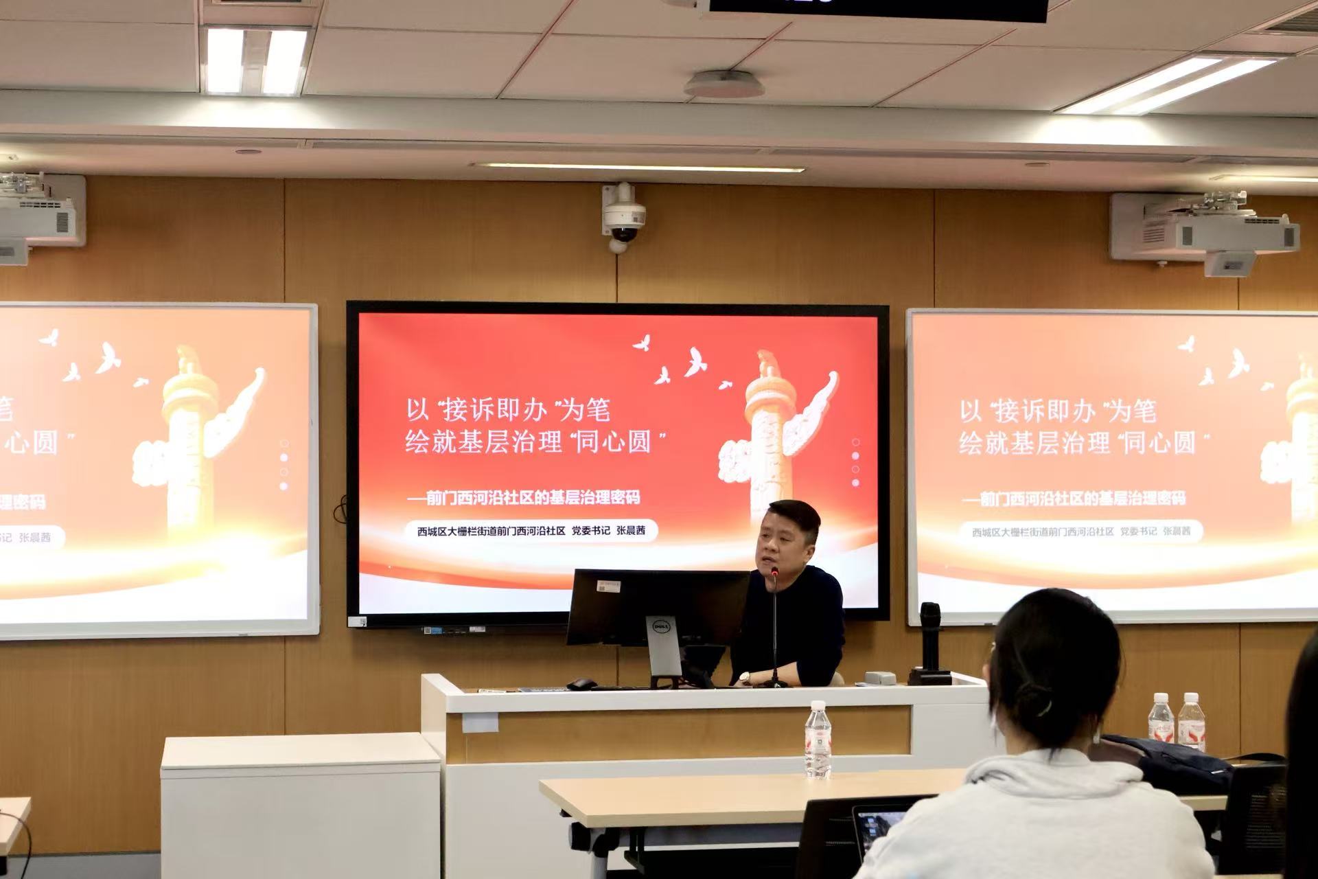 为深入学习贯彻党的二十届四中全会精神,全面落实党中央关于加强和创新基层社会治理的重要部署,11月27日,学院行政管理学系党支部联合2025级硕士生1班党支部、行政管理本科生党支部、行政管理本科生第二党支部共同开展11月主题党日活动。本次活动紧扣“党建引领城市基层社区治理现代化”主线,邀请北京市西城区“红墙先锋”社区治理导师团成员、月坛街道月坛社区党委书记张骥和大栅栏街道前门西河沿社区党委书记张晨茜,分享党建引领基层社区治理现代化的生动实践。学院教授康晓光,北京市西城区委社会工作部韩旭、徐存阳出席活动,行政管理学系党支部赵檀主持。