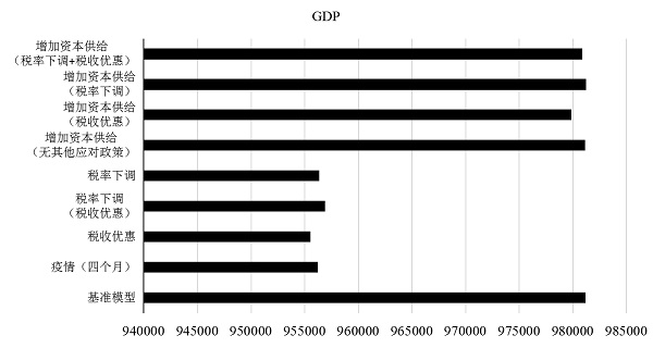 通过模型模拟,如图1所示,在不采取税收优惠政策的前提下,在受疫情影响一个月的模型基础上增加资本要素供给4634亿元,2020年模拟得到的GDP总量能够恢复到基准模型不发生疫情时的水平。在此基础上进行税率下调,经济增长会不增反减。同样,如图2所示,假设疫情影响四个月时,在不采取其他经济恢复政策的前提下,资本要素供给需要增加20643.1亿元,经济才能恢复到基准模型水平。而从多重经济恢复政策的影响来看,也只有下调增值税税率后,经济总量会比只增加资本供给时的GDP要更高一些。