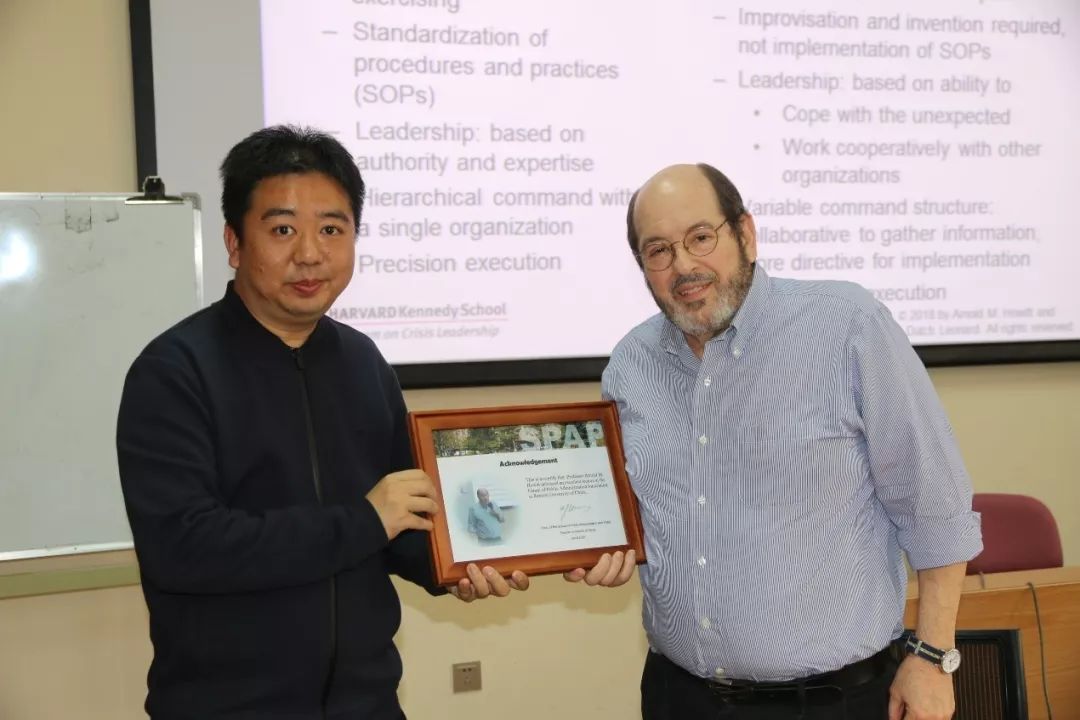 Howitt 博士的讲座内容引发了在场师生的积极思考和踊跃提问。围绕火灾防御制度、研究方法、现场访谈、以及我国应急管理制度等内容做了热烈讨论。讲座结束后,Howitt博士接受了我院颁发的求是讲座证书,并与部分师生合影留念。