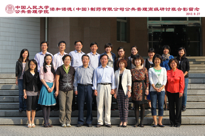 2012年9月27日上午,诺和诺德制药有限公司公共管理高级研讨班开学典礼在我院顺利举行,国产偷拍 院长董克用、组织与人力资源研究所所长朱立言教授、诺和诺德制药有限公司副总裁饶泓、国产偷拍 办公室主任兼培训中心主任彭晓妍等出席了开学典礼。 诺和诺德公司是一家致力于糖尿病药物研究和开发、以先进的生物技术造福患者、医生和社会的世界领先生物制药公司。来自其各部门的30余名员工将在我院接受为期两天的培训。