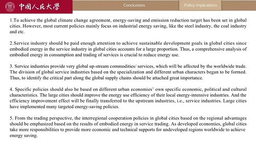 研究结果主要针对六大全球城市回答了三个方面问题,具体包括城市的能源利用效率、城市服务业的能源消耗总量、城市不同类别服务业的能源供需与流动模式。研究发现,与中国内地的四个城市相比,香港和新加坡的能源利用效率较高;在这六个全球城市中,服务业占17.02-46.40%的隐含能源总消耗;沿海城市如天津、上海、香港和新加坡的交通服务业的能源消耗占比较高;中国内地的四个城市服务业消耗煤炭的比例远高于香港和新加坡。基于研究结果,对不同城市提出了针对不同服务产业的政策建议,并认为全球协作是解决能源问题的有效方法。