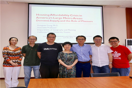 2017年6月26日中午,美国加州州立大学弗雷斯诺分校董宏伟副教授应邀出席我院求是学术讲座第50讲,做了题为《美国大城市的住房负担危机:供给侧和需求侧的分析以及规划师的角色》的精彩演讲。董宏伟副教授从供给侧和需求侧的角度,以两个实证研究深度剖析美国大城市的住房负担问题。来自我院各系所30余位师生和住建部、中规院的同行积极参会并进行热烈讨论。