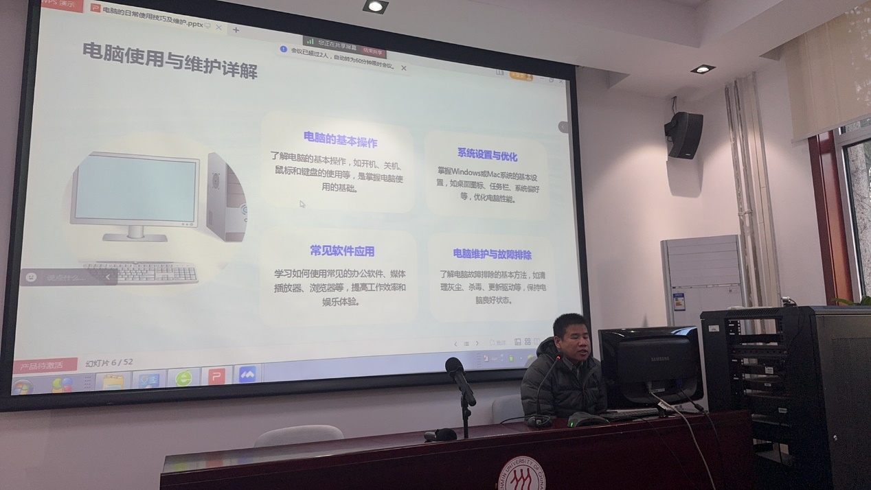 白志会工程师以《办公设备的日常使用技巧及维护》为题进行讲授,内容涵盖“电脑使用与维护详解,电脑的日常维护,风扇除尘和保养,电脑的故障检测,电脑的故障维修,安装系统、驱动、软件、打印机,磁盘清理,微信清理,杀毒软件的使用方法,Office组件快捷键技巧,AI的使用方法”等方面,既有很强的实用性、实操性,又对于理解、掌握和运用数智赋能办公信息化具有很好的导引作用。