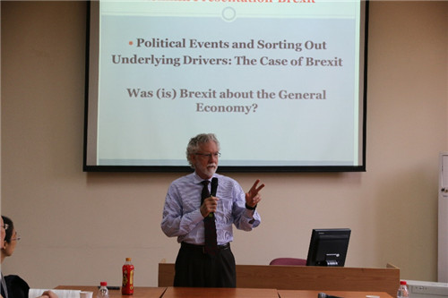 美国康涅狄克大学房地产和城市研究中心主任John Glascock教授做了题为《政治事件及其潜在的驱动因素——以英国退出欧盟事件为例》的报告。首先提出了研究问题——英国脱欧是否与总体经济发展相关。在基于完整的论证与分析后,得出两点结论:一是英国脱欧与总体经济发展相关,且脱欧公投对英国的经济是一个沉重的打击;二是这次公投的结果导致了移民英国的人数大幅下降。