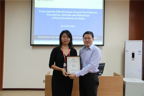英国剑桥大学土地经济系Helen Bao副教授做了题为《基于中国农村居民的认知、态度和行为研究土地利用政策的信任度和有效性》的报告。目前在中国政府信任度偏低的地区,政策执行程度较低。基于这种现象,Helen Bao副教授提出用行为科学的方法提高民众对政府的信任度。并在分析中国农村居民的认知、态度和行为特性后,提出从中国农村居民行为的视角来研究土地利用政策的信任度和有效性。