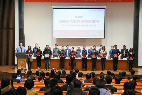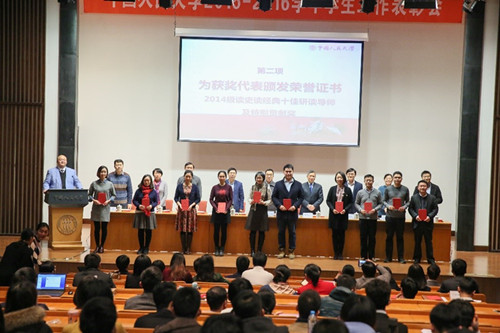 洪大用副校长首先宣读奖励授予决定,参会校领导一同为获奖代表颁发荣誉证书。我院获得2014级“读史读经典优秀组织奖”;程秀英老师获得2014级“读史读经典十佳研读导师”称号。颁奖结束后,党委副书记、纪委书记吴付来进行总结讲话。