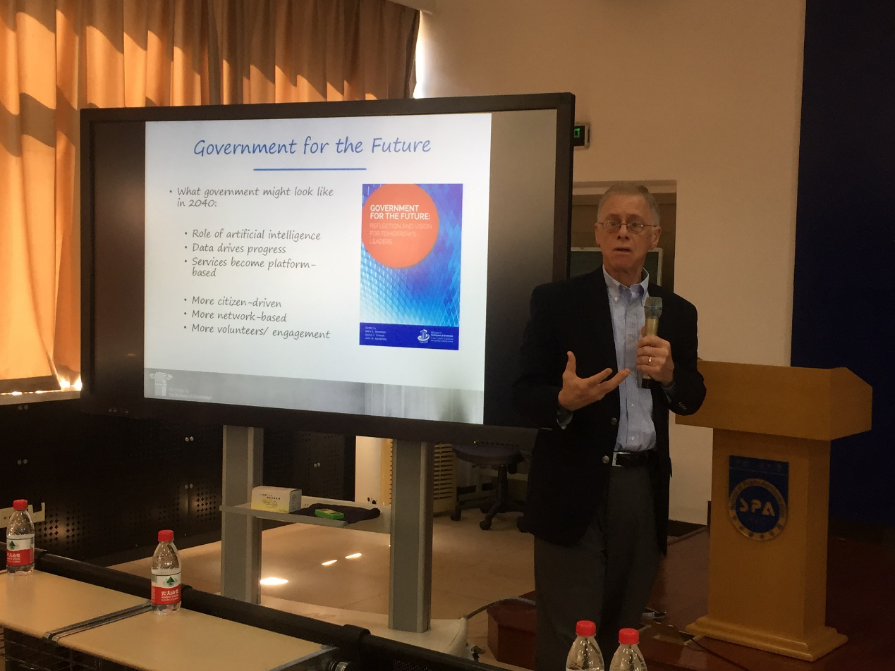 2018年9月24日中午,美国IBM政府运营中心高级研究员John M. Kamensky先生应邀访问国产偷拍 ,并在国产偷拍 报告厅做了题为“2040年的政府:未来的挑战”的学术讲座。本次讲座由我院院长杨开峰教授主持,来自学院内外百余名师生参与。