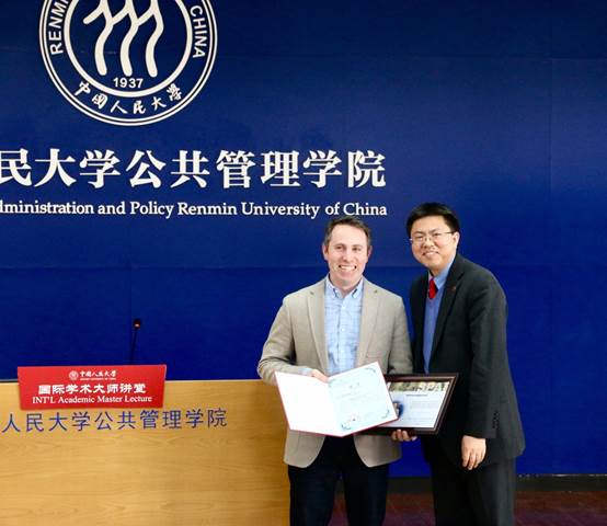 讲座结束后,杨开峰院长代表学校向Donald Moynihan教授颁发了“国际学术大师讲堂”证书,同时颁发了我院的“求是学术讲座”证书,感谢他给予精彩演讲。