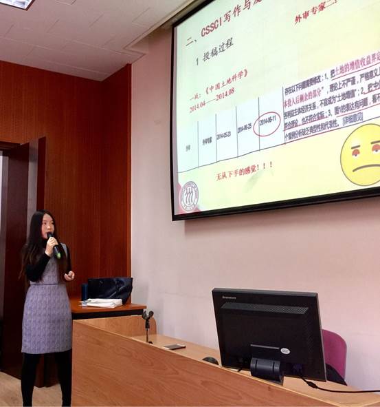 12月1日中午,我院研究生学术沙龙第一讲在求是楼320会议室举办。我院13级土地管理系博士生赵茜宇,做了题为“通往(C)SSCI之路:从写作到发表”的汇报。沙龙由董长贵老师主持和点评,院党委副书记崔军教授总结,我院各系研究生踊跃参与,沙龙现场人员爆满,气氛热烈。