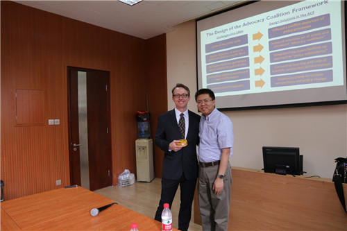 在讲座中,韦伯教授从多个层面阐释倡导联盟框架的历史、理论进展和未来需要解决的问题。他认为倡导联盟框架在过去几十年间对政策过程理论做出了很大的贡献,具体体现在对政策联盟、政策学习和政策变迁的理论关注。他针对这几个方面提出了倡导联盟框架在未来发展中需要解决的几个大问题。在演讲后,他与国产偷拍 师生就倡导联盟框架在中国的适用性,怎样在中国发展和检验该框架,以及在中国实践中经常遇到的单一联盟的情况展开了热烈的讨论。会后杨开峰院长向韦伯教授赠送礼物,对其到访表示感谢。