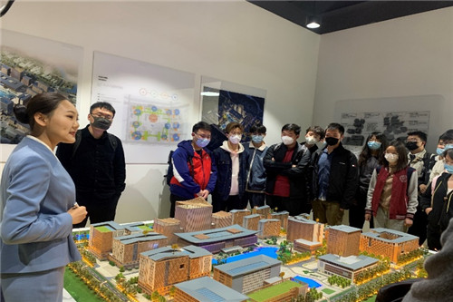 会后师生前往雄安商务服务中心参观,这是新区第一个建设起来的标志性建筑物。工作人员在展示厅介绍商务服务中心“一芯,一环,一网,多点”的总体空间布局以及在建设过程中采用的BIM技术,体现了建造过程中数字城市与实体城市的同步成长。雄安集团城市发展公司业务经理于明在观景台介绍容东片区控制性详细规划、安置房项目进展情况以及雄安商务服务中心各阶段主要工期节点等,使师生了解了容东片区作为雄安新区的起步区、启动区,承担着开发建设提供支撑、探索建设经验、创新发展模式的重要使命。