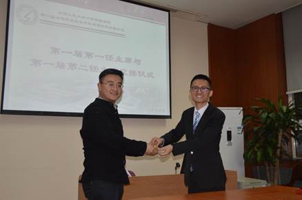 闭门会议结束后,第一届第一任研究生会主席郎昱向委员会报告了第一届第二任主席选举结果和第一届第二任主席团分工情况,施文凯当选我院第一届第二任研究生会主席。随后,举行了两任主席交接仪式。