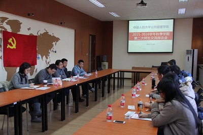 12月18日,学院召开2015-2016学年秋季学期第二次师生交流座谈会,院党委书记李家福、团委书记谷昆鹏、党务秘书陈夏、学生事务秘书刘畅及10名学生党支部书记代表和学生干部代表参加此次座谈会。代表学院党委欢迎各位同学参加此次座谈会,简要介绍了此次座谈会召开的背景和意义。与会的学生党支部书记代表、学生干部代表结合自身经历就学生支部建设、活动开展、信息传递、课程设置等方面分别发言。表示,学院将高度重视同学们的意见和建议,希望同学们在日常生活留心观察、认真思考,继续关心和支持学院的改革和发展。