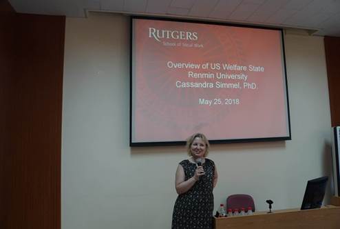 随后,师生讲座环节正式开始。首先,罗格斯大学Simmel教授以“Social Welfare Policy in the United States”为题,从多个方面对美国社会福利政策展开了详细介绍,强调机会、生活质量以及幸福感等是社会福利政策中不容忽视的问题,演讲还结合了美国当前福利政策的很多现实问题。