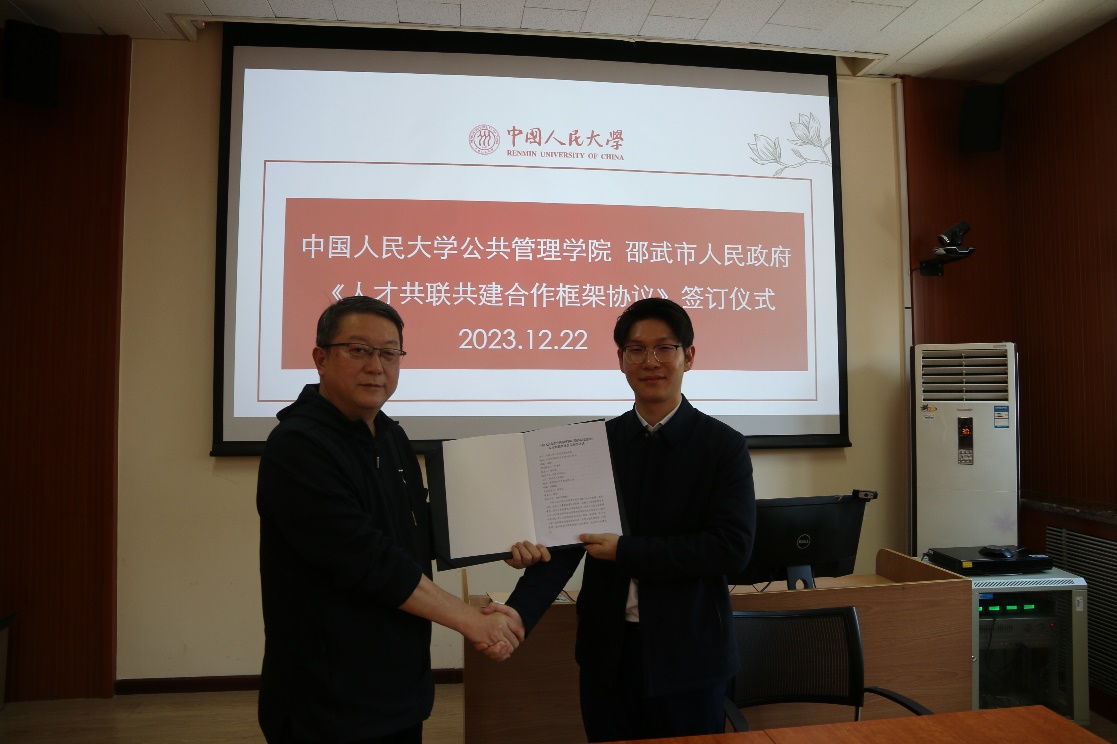 学院副院长崔军、邵武市人民政府副市长郑垚分别代表双方签订《人才共建共联合作框架协议》。